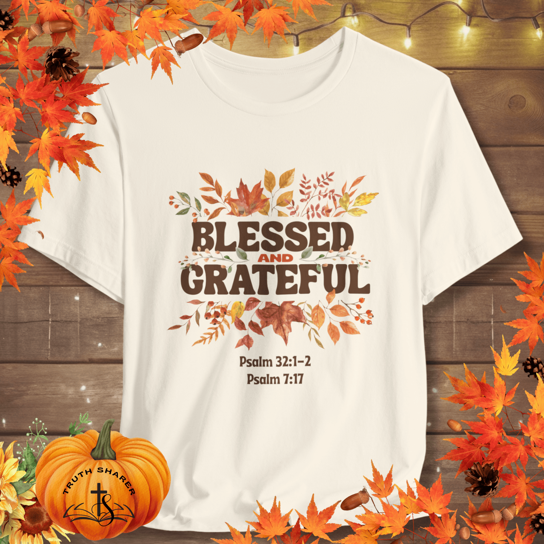 Surrounded by autumnās beauty, this design proclaims a deeper truth: to be Blessed and Grateful is to live in the light of Godās mercy. Framed by fall leaves and berries, the words rest on the promises of Psalm 7:17 and Psalm 32:1-2āpraising the Lord for His righteousness and celebrating the joy of sins forgiven. Ā